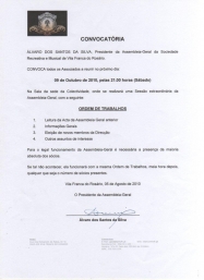 Na Sala da sede da Colectividade, onde se realizará uma Sessão extraordinária da Assembleia-Geral, com a seguinte: